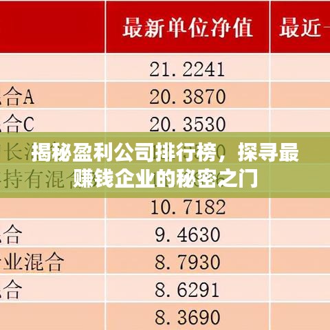 在当今世界,企业的盈利状况是衡量其成功与否的关键因素之一,盈利公司排名反映了全球各大企业的经济实力和业绩表现,本文将深入探讨盈利公司排名背后的因素,揭示最赚钱企业的奥秘。